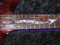 The guitar has real Pearl and Abalone inlaid into the body. The Great Red Dragon was completely hand made. The tail of the dragon goes up the fingerboard and it's tip stops at the 12th fret. One Seymour Duncan Distortion Plus in the bridge position with the three-way operating as a shutoff. One Volume and one Tone knob!